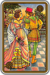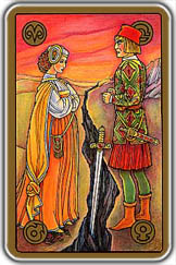 Символика карты «Ссора»Красный фон неба – агрессивное состояние взбудоражило головы, что породило обоюдная непримиримость и конфликтность. Желтый фон земли – обман, ревность, предательство явились основой ссоры. Расколотая земля - разрушительная энергия Воина вторглась во взаимоотношения Пары, поставив их по разные стороны баррикад, где каждый отстаивает свою точку зрения. В расщелину земли воткнут меч с треснутым сердцем - чувства дали трещину, что породило жесткое непонимание, отчуждение и кризис отношений. Партнерский союз разрубается мечом, хотя чувства любви еще теплются. Розы под ногами - символ чувственных удовольствий, женственности и любви - растоптаны. Перекрещенные руки на груди – защита от агрессии и импульсивности, нет желания понять и пойти навстречу. Сжатые кулаки, напряженные позы – сдерживающая злость и ярость. Меч на боку Воина – боевой запал и непримиримость. Гора, со стороны Воина – основной зачинщик проблемы и конфликта. Кошелек у Возлюбленной – деньги в одних руках, что могло явиться «яблоком раздора» и привести к ссоре и непониманию. Астрологические показатели Марса:Изгнанный Марс в Весах или в 7 доме - человек не может гармонично себя проявить в различных партнерских взаимоотношениях. Негативная, огненная энергия скапливается внутри и вырывается, порой, не там где надо, не к месту или не вовремя и порождает неуправляемость, скандальность, импульс, неуравновешенность, резкость, истерики, перепады настроения. Особенно острая, негативная реакция проецируется на несправедливость по отношению к нему, на его взгляд. Изгнанная Венера в Овне или в 1 доме - игра в сильную личность в любовном или материальном плане. Пытается быть сильнее своего партнера, проявлять свое превосходство над ним. В отношениях нет мягкости, нежности, чувства кричащие, экспрессивные, повышенная потребность в сексуальной реализации и требующая к себе любви, из-за чего много любовных страданий и истерик. Открытый бой с партнерами. Изгнанный Хирон в Овне или в 1 доме, сигнификатор 7 дома - человеку сложно оценить ситуацию, сделать правильный выбор, подобрать ключ и разрешить вопросы с дипломатичностью и тактичностью. Проявляется порой своеобразно: где надо - он не дипломат, нет объективности, противоречит сам себе, не умеет обойти острые углы, а где не надо - миротворец, начинает уравновешивать ситуацию, в которой сам особо и не разобрался. Если начинает хитрить, то его хитрость сшита белыми нитками. Если служит и нашим и вашим, то становится интриганом, обладает двойственностью, резкостью суждения, «сидение на 2-х стульях». Часто - сбои в здоровье и настроении. Марс в оппозиции к Венере - нет понимания, душевный надрыв, видение ситуации, как в кривом зеркале, разорванность чувств, "перетягивание одеяла на себя", но в тоже время сильный сексуальный аспект. Ответ:Ответ однозначный – работать над собой необходимо в любых партнерских взаимоотношениях, которые могут быть связаны и с брачными партнерами, и с любыми другими людьми, с которыми человек взаимодействует один на один. Сюда также включаются конкуренты, соперники, а также оппоненты, с которыми возможны гражданские, процессуальные тяжбы. Совет:Утверждая и проявляя себя в жизни необходимо проявлять корректность, дипломатичность и гармоничность. Все вопросы нужно решать спокойно и бе